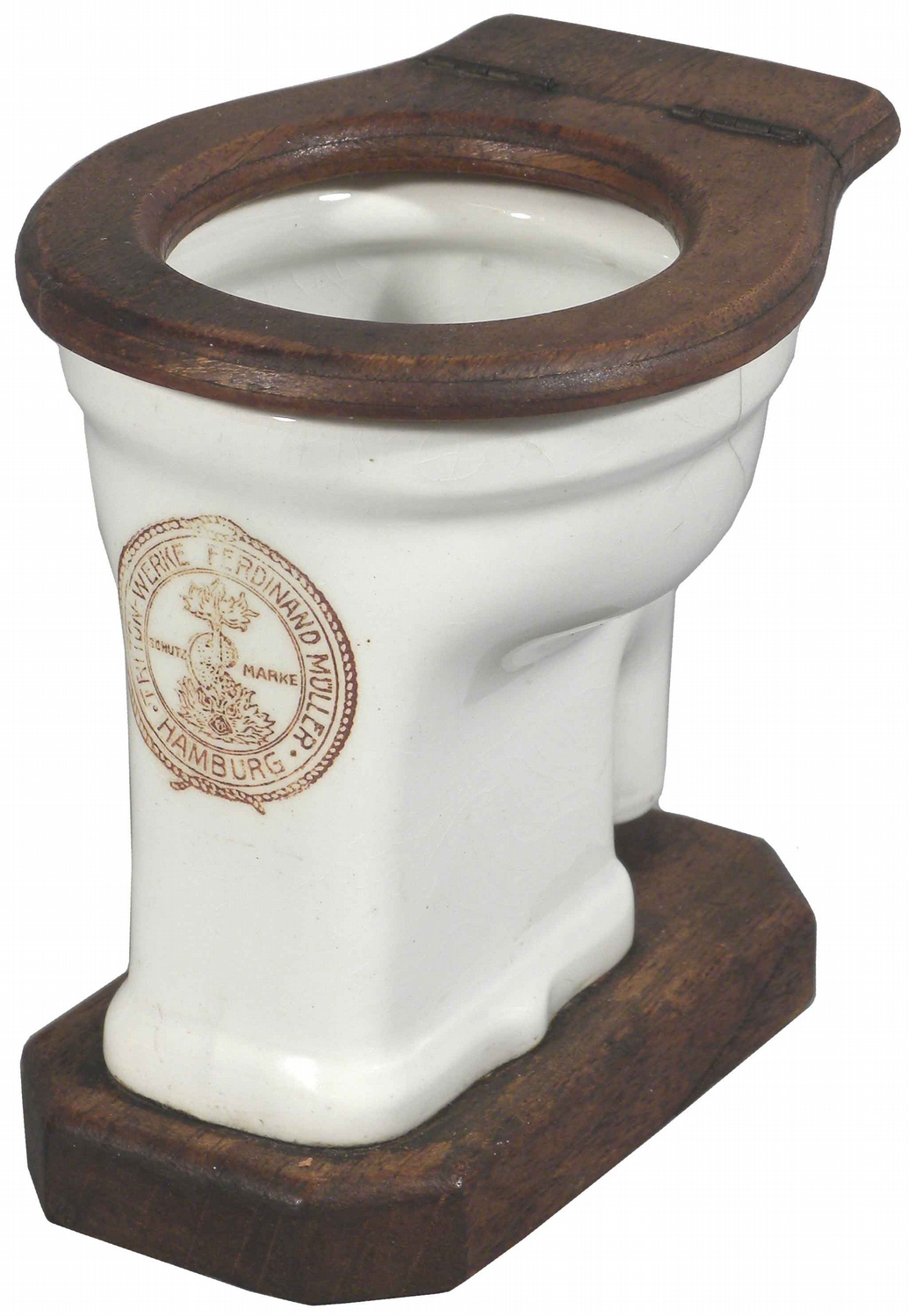 Salesman Sample Toilet. Triton-Werke Ferdinand Muller-Hamburg makers. Wood and porcelain. Crazing and slight crack on right side. 4 X 5 X 5 inches.