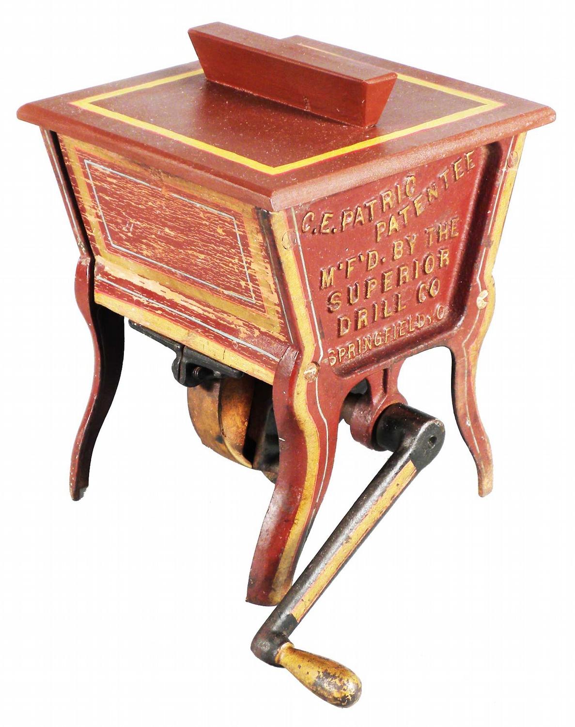 Salesman Sample Wheat Separator/Grinder. Mfg by the Superior Drilling Co. Springfield, O. C.E. Patric Patentee. Lid not original otherwise excellent condition. 9 1/2 X 8 1/2 X 7 1/2 inches.