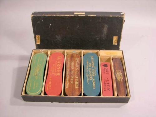 Salesman sample box of women's brushes, showing various advertising on brushes, including 6 various brushes.