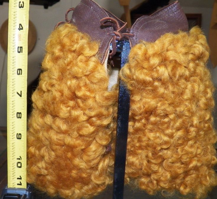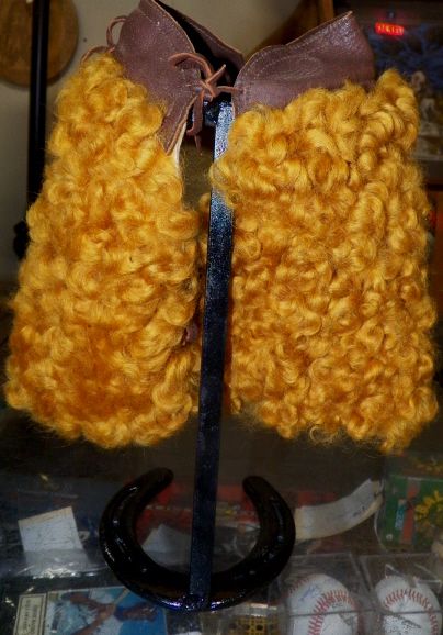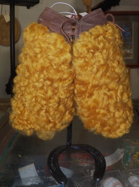 Fantastic salesman sample minature orange woolie chaps on stand. shotgun style. Hand made fantastic orange color with leather top approx 8" tall Like new Condition. A real Collectors item and very hard to find