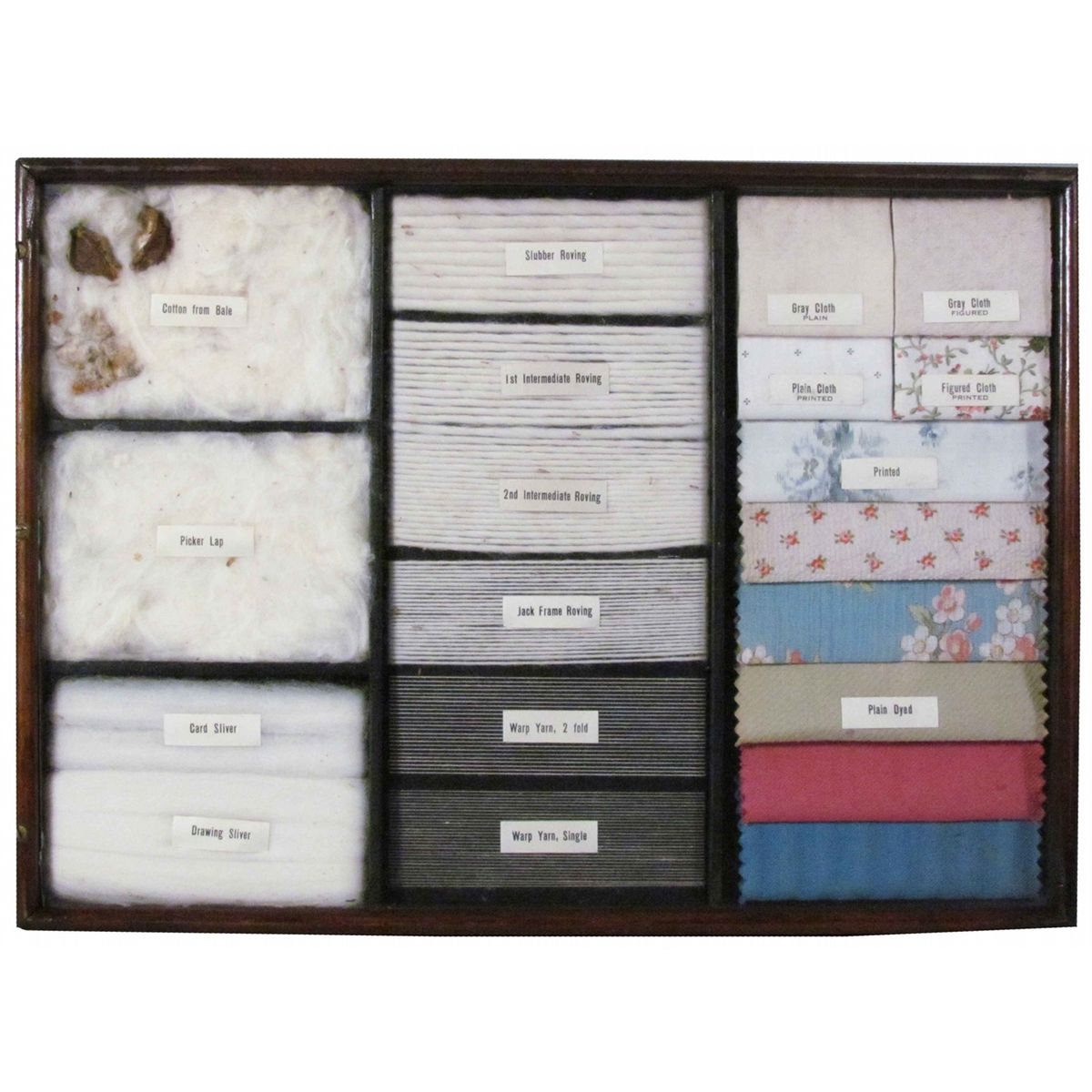 Salesman Sample of Textiles for Pacific Mills, Lawrence, Mass. Sample box for cotton fabric, from farm to finished product. Picture of Pacific Mills Factories on lid. Excellent original condition. 17 1/4 X 2 X 13 inches.