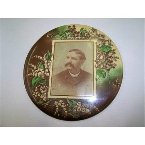 This large 9" photo button came from an estate where the great grandfather was a door to door salesman for the Cruver Mfg. Co. in the 20's. He would have carried this button among many others of different kinds, knocked on a door and ask the lady of the house if she was interested in a beautiful color photo of a loved one, animal or whatever she wanted on it. Some were used to remember a loved one that had passed on & put on their tombstones as they are weather resistant. He would have had all kinds of charts, and colors and prices to choose from. <p>