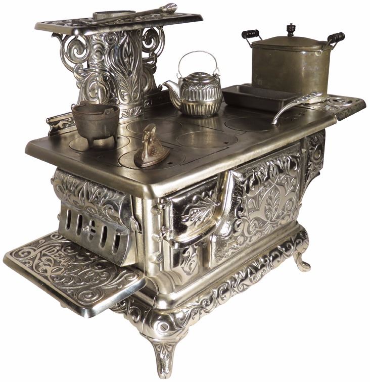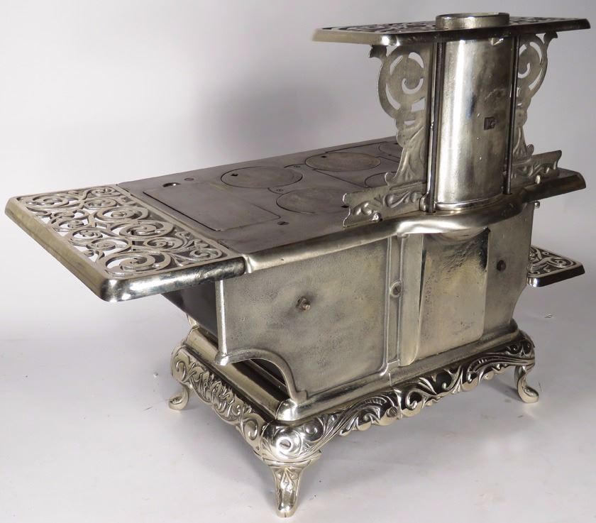 Turn of the Century Salesman's Sample / Child's Ideal Model 5 Cook Stove. Nickel plated cast iron. Comes with accessories. Excellent condition. 23 1/2 X 16 3/4 X 12 inches.