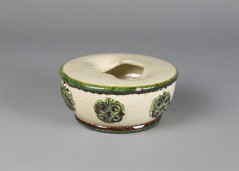 The body with 6 applied roundels, shaped opening all in a green, brown and cream glaze. 6.5"Dx3"H, small glaze chip, a very nice, unusual and early spittoon.