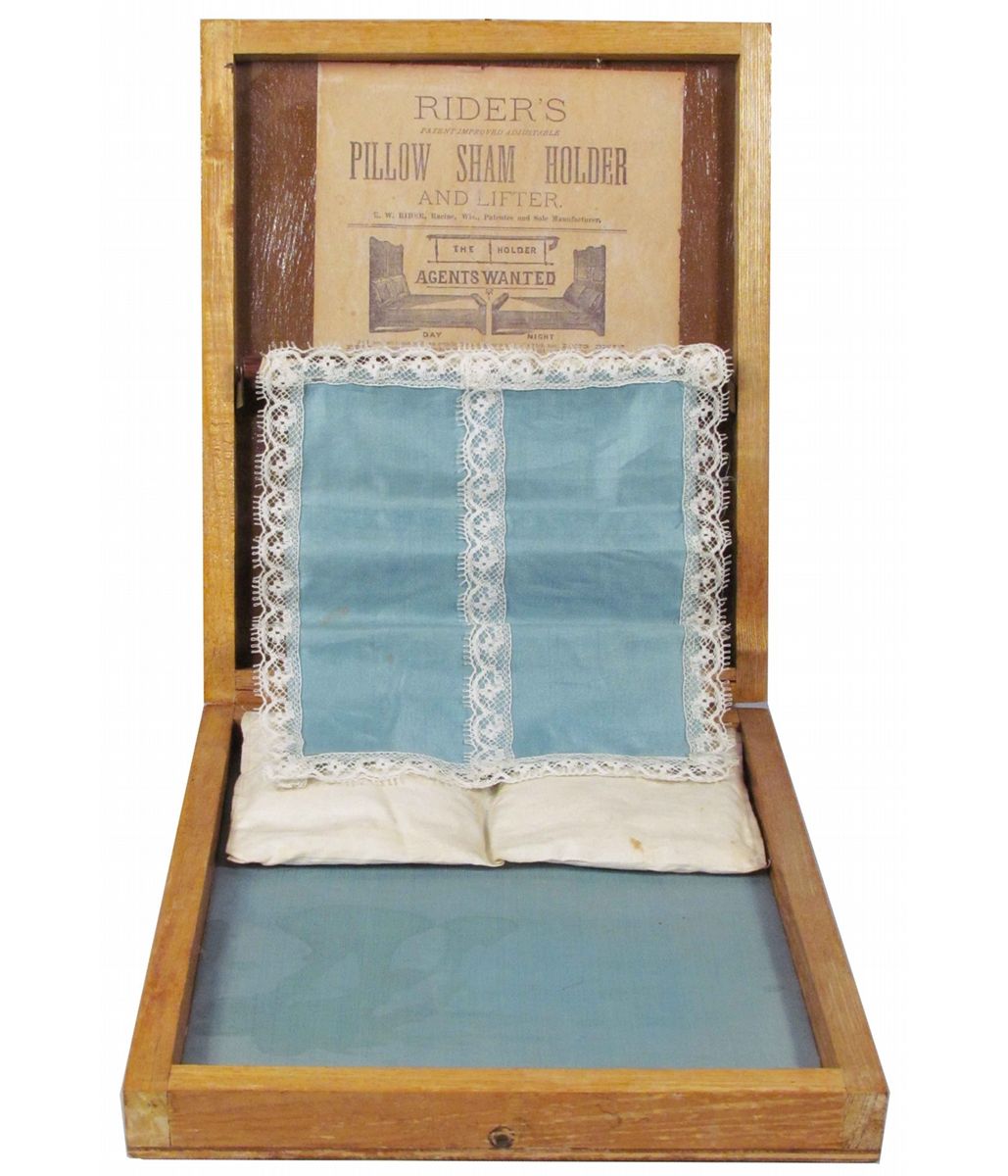 Salesman's Sample Pillow Sham Holder & Lifter. R.W. Rider, Racine, WI. Maker. Demonstrates how to save time with new device. Some minor stain on satin otherwise excellent condition. 8 3/4 X 1 3/4 X 10 1/2 inches.