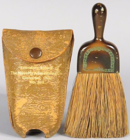 Salesman's Sample Whisk Broom. The Novelty Advertising Co. Coshocton, Ohio No. 312. Metall handle in leather sheath. Excellent condition. 4 3/4 inches tall.