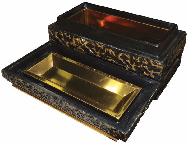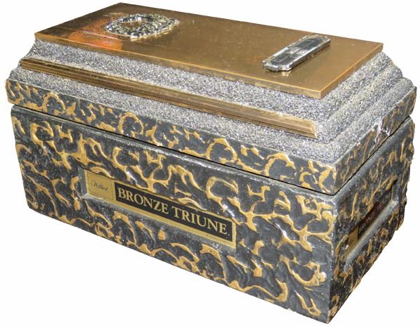 Salesman's Sample Wilbert Bronze Triune Buriel Vault. Stain on lid otherwise very good condition. 18 X 10 X 9 inches. Weight Approx. 60-70 lbs.