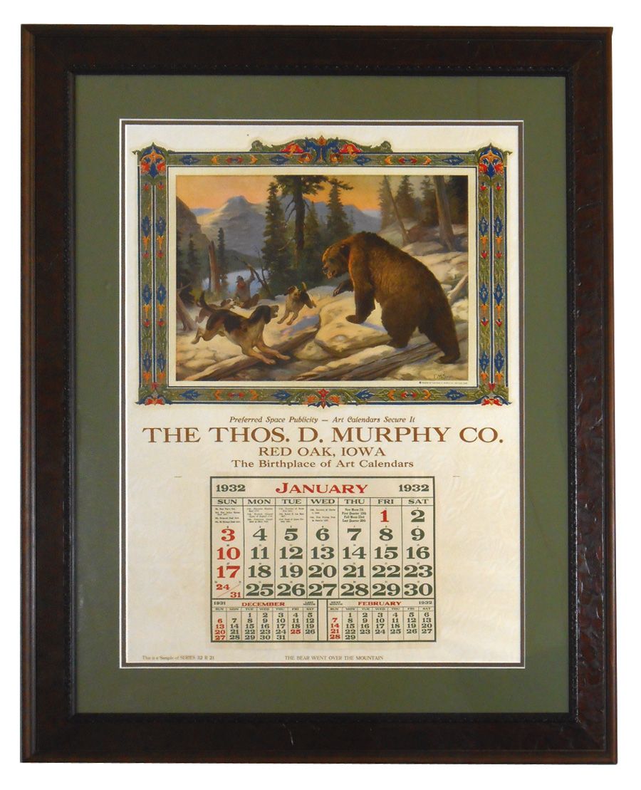 Salesman's sample calendar from Thos. D. Murphy Co.-Red Oak, IA, c.1932, F. M. Spiegle illus "The Bear Went Over The Mountain", Exc cond, prof double matted & framed, 34"H x 27"W.