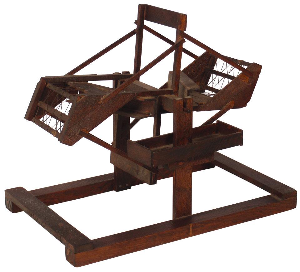 Salesman's sample or working model gleaner, wood & metal construction, revolves, VG cond w/old patin