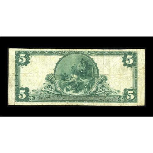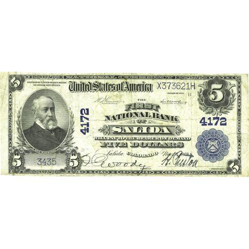 <B>Salida, CO</B></I> - $5 1902 Plain Back Fr. 601 <B>The First NB</B></I> Ch. # 4172<BR>While small notes from this Chaffee County bank abound, large examples are quite another matter, with the census from here standing at just five pieces. This pleasing pen signed <B>Fine+</B></I> specimen is among that handful. Expect to see bidding easily reach the level of...