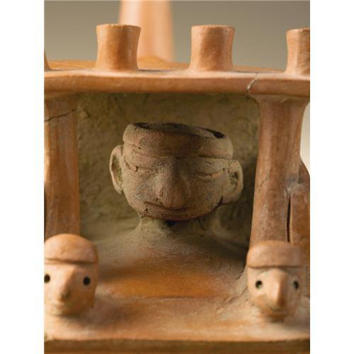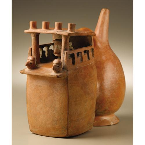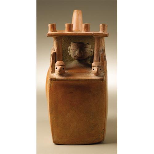 <B>Double-chambered Single-spout Vessel</B></I><BR>Salinar<BR>300 - 100 B.C.<BR>Burnished orangeware, resist painting<BR>Height 7 5/8 in. Width 3 3/4 in.<BR><BR>The squared-off front chamber is topped by an open-fronted shrine inside which can be seen a large head. Two smaller heads flank the flat area in front of the shrine. The total unit indicates one form of shrine developed by the Salinar culture. The globular rear chamber rests on a low-flanged base and contains the slightly backward-slanting spout.The overall condition is good, with some reglued breaks and minor fills. Missing parts of the flanged base have been replaced.<BR><BR>Provenance<BR>Bonhams & Butterfields, San Francisco: sale 7437 E, 9 June 2003, lot 5076, pp.18-19<BR><BR>