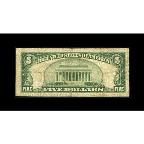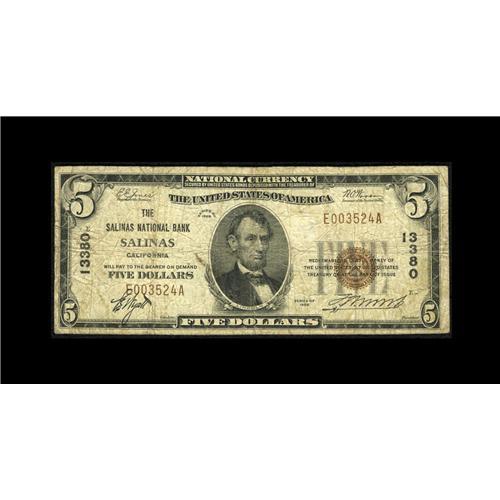 <B>Salinas, CA</B></I> - $5 1929 Ty. 1 <B>The Salinas NB</B></I> Ch. # 13380<BR>Well-traveled, yet intact is this $5 from this popular collecting locale. <B>Very Good.</B></I>