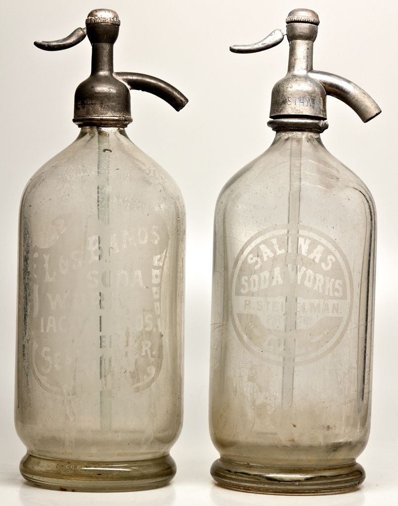 Lot of 2: 1) 12" x 4", clear glass, front etched SALINAS SODA WORKS P. STEIGELMAN PROP`R. CAL. Footed base worn around the edges on the bottom, a few long surface scratches, chrome SILVER STATE top, intact tube. A hutchinson bottle was made by the same company. According to "A Look at California Hutchinson Type Soda Bottles" by Peck and Audie Markota, "In the early 1880s Philip Steigelman started the Salinas Soda Works on California Street near Gabilan Street, where he manufactured soda water until sometime around 1910." 2) 11.75" x 4", front etched LOS BANOS SODA WORKS IACOPI BROS. SELTZER WATER. Clear glass bottle with a few small dings, some staining, but intact. Footed base etched MADE IN AUSTRIA with a bird symbol. Chrome SFSWCO top. According to ancestry.com, Felice Iacopi and his brother, Angelo Iacopi, bought the Los Banos Soda Works in 1901 and they operated it for a time until Felice sold out to his brother and built an ice plant. -59421