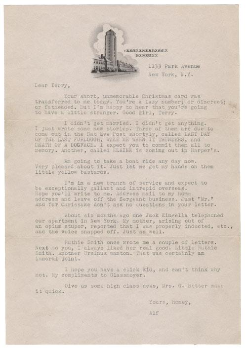 J.D. Salinger typed letter signed ''Alf'' in type. To Frances Terry Glassmoyer, Salinger writes of short stories he's writing, ''Last Day of the Last Furlough,'' ''Wake Me When It Thunders,'' ''Death of a Dogface'' and ''Elaine.'' Single page letter measures 7.25'' x 10.5''. With original envelope postmarked Chicago, IL, 4 January 1944 but with Salinger's New York return address. Pencil military sketches on verso of envelope probably by Salinger because they mock the expanding waistline as a soldier�s rank increases. Very good condition.