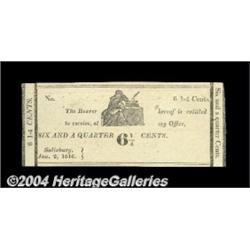 Salisbury, MD- Unidentified Issuer 6 1/4ó Jan. 2, 1816 Shank 116.1.3Attributed in Shank to Dr. John Huston, who operated a banking house from his office at Bank Alley and Bridge Street. Uncirculated, listed as R-7 in Shank. <BR><BR><B>Important notice:</B> Heritage usually auctions material at the rate of 200-250 lots per hour. On some occasions eBay Live bid software or the Internet may not be able to keep up with the pace of the auction. We recommend placing a realistic absentee bid now as insurance to avoid disappointment. Occasionally the auctioneer may eliminate or reject an eBay Live bid, and the auctioneer may also reopen a lot after the close of the eBay live bidding (usually because we missed an audience bid), and may reject your bid even if it shows you as the winning bidder. By bidding via eBay Live, you agree that Heritage may award the lot to another bidder at its sole discretion under the circumstances described above or any other reasonable circumstances. Since eBay bids are not shown to us until we open the lot on the floor, we treat those bids just like floor bids. In most cases the floor responds before the eBay bid is presented to us, due to Internet lag time, so for consistency we have made it a policy that floor bids are always considered first over tie eBay live bids. Also please note that all Heritage lots purchased through eBay Live carry a 20% Buyer's Premium. Please make sure you read the Terms and Conditions before you bid. <BR><BR><B>IMPORTANT ANNOUNCEMENT ABOUT RESERVES:</B> Heritage now divulges all reserves on its web site 7 days before every auction. If you want to know whether the reserve on this lot has been met, and if not, what the reserve amount is, please visit this lot page on the HeritageCoin.com web site, or email: bid@HeritageGalleries.com