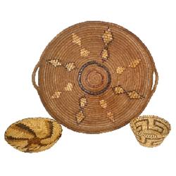 Salish Indian tray w/2 handles, imbricated design, red cedar bark & cherry bark, Exc. condition, early 20th Century, 16"Dia. & 2 Papago Indian baskets, both Exc. condition, 5" & 7"Dias.