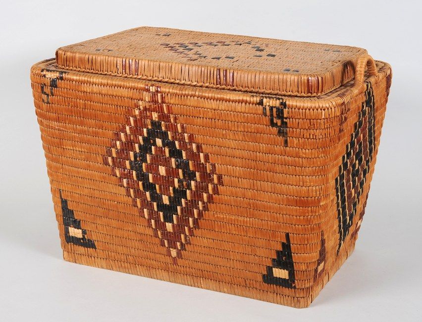 Salish Lidded Basketry Trunk with Diamond Imbricated Design 22 1/2" L. 16" W. 15" H. Good Condition, Missing One Handle