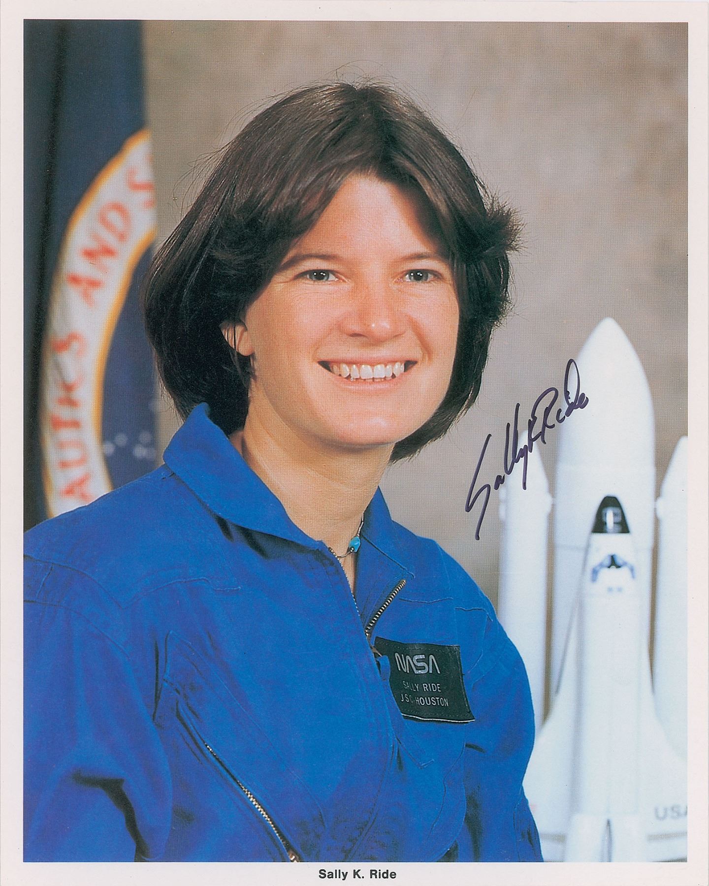Official color 8 x 10 NASA lithograph of Ride posing in her blue flight suit in front of a Challenger model, signed in black felt tip, "Sally K. Ride." In fine condition.