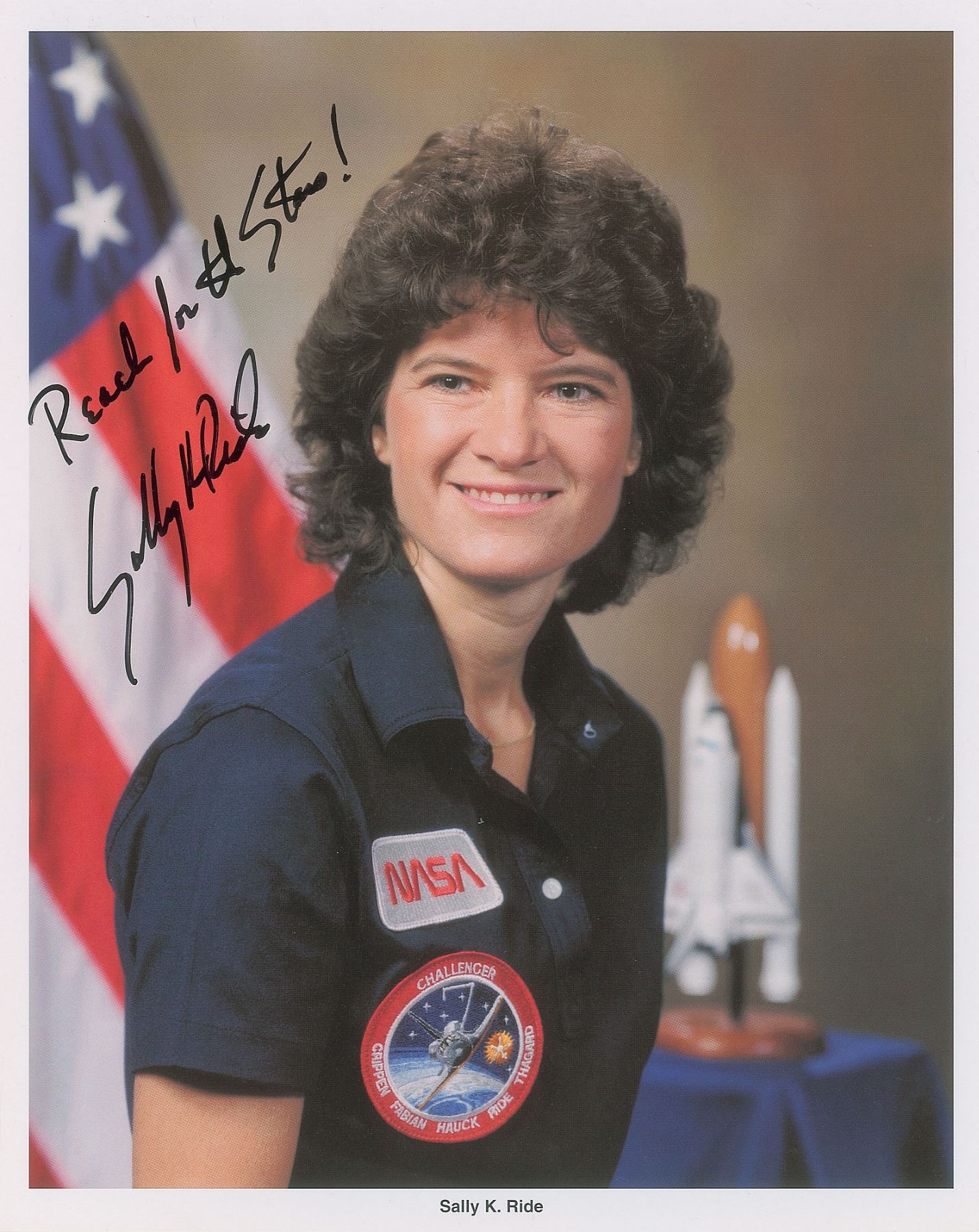 Official color 8 x 10 NASA lithograph of mission specialist Ride wearing a polo shirt with STS-7 patch, signed in black felt tip, "Reach for the Stars! Sally K. Ride." In very fine condition.