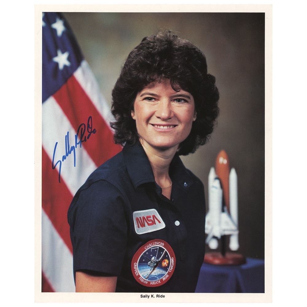 Official color 8 x 10 NASA lithograph of Ride with a STS-7 patch on her shirt, signed in blue felt tip, "Sally K. Ride." In fine condition.