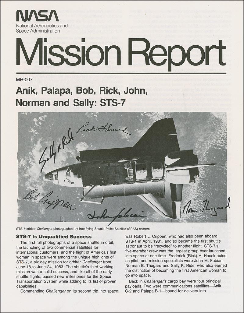 NASA mission report for Challenger mission STS-7, 8.5 x 11, 4 pages. Signed on the front in black felt tip by crew members Sally Ride, Bob Crippen, Norm Thagard, Fred Hauck, and John Fabian. In fine condition, with some mild handling wear. Pre-certified Scott Cornish and RRAuction COA.