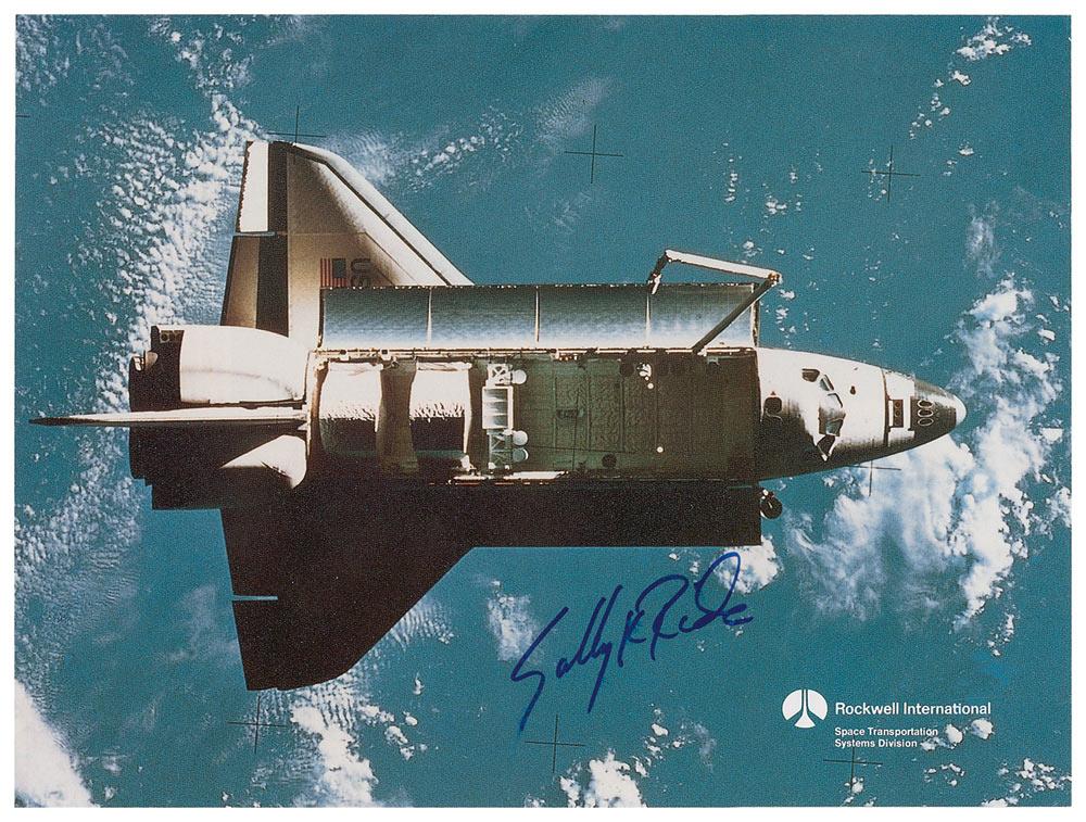 Color 11 x 8.25 Rockwell International magazine photo of a space shuttle in orbit signed in blue felt tip “Sally K. Ride.” Several scattered bends and creases and a slight brush to Ride’s middle initial, otherwise fine condition. None of the defects take away from the attractive image or signature.