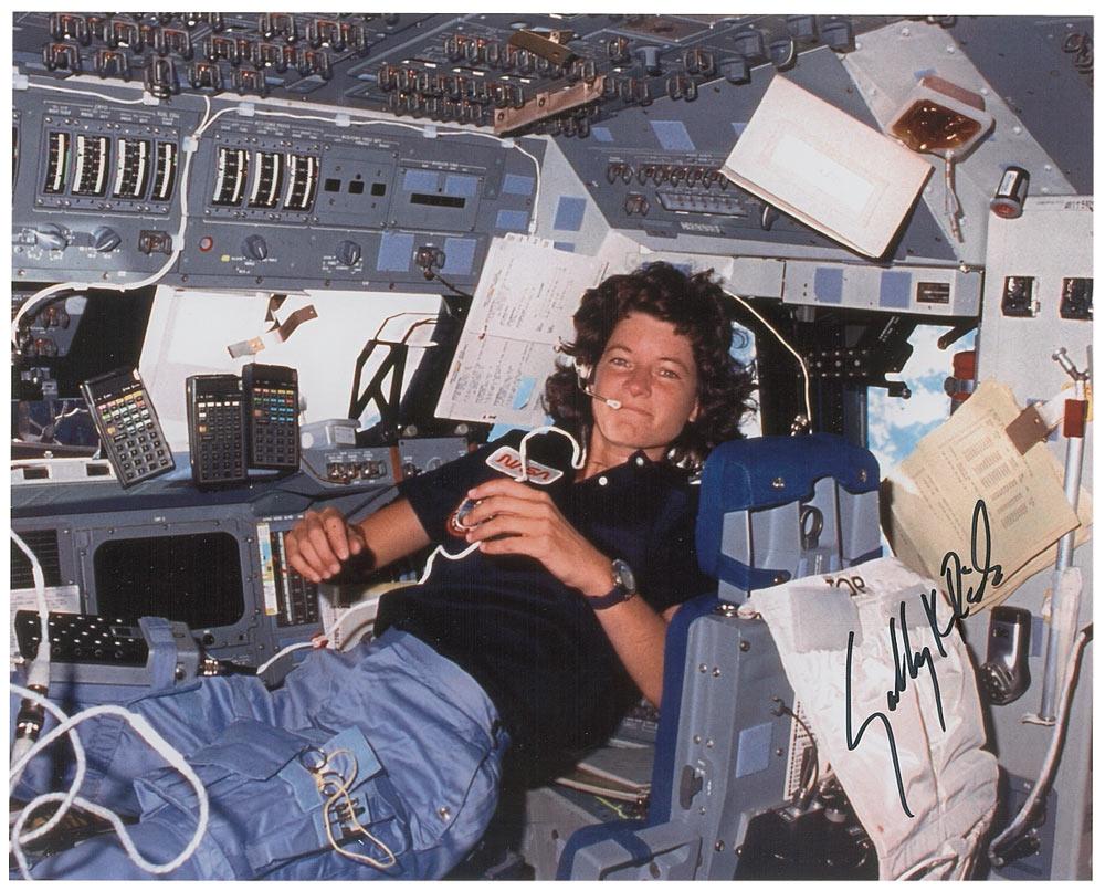 Color satin-finish 10 x 8 photo of Ride floating in the helm of the shuttle, signed in black felt tip, “Sally K. Ride.” In very fine condition.