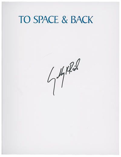 Signed book: To Space and Back. First edition. NY: Lothrop, Lee & Shepard Books, 1986. Hardcover with dustjacket, 9 x 11.5, 96 pages. Signed in black felt tip on the half–title page “Sally K. Ride.” In fine condition.