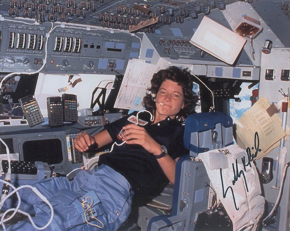 Color satin-finish 10 x 8 photo of a weightless Ride in the cockpit of the shuttle, signed in black felt tip, “Sally K. Ride.” In very fine condition. Accompanied by a 2006 form letter bearing a printed signature.