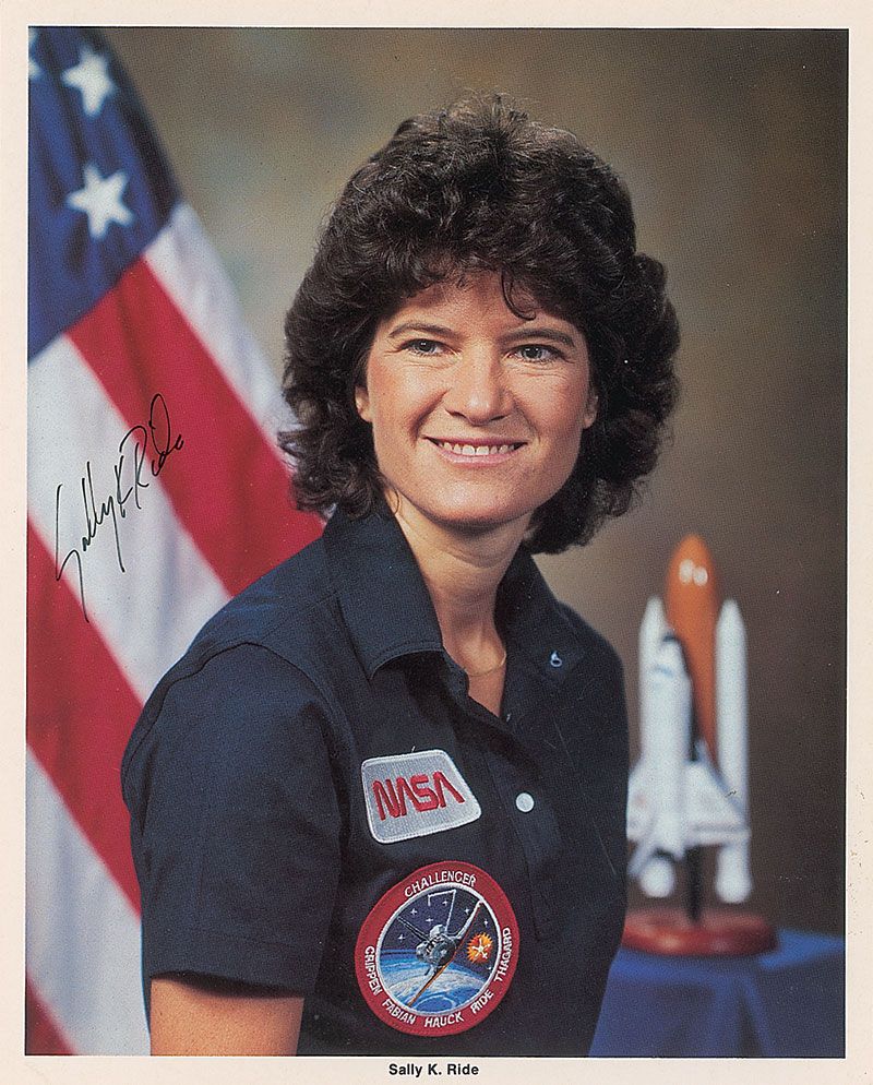 Color 8 x 10 NASA photo of Ride with a shuttle model behind her, signed in black felt tip, “Sally K. Ride.” In very fine condition.