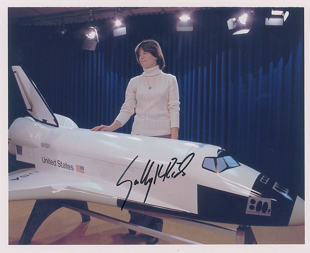 Color satin-finish 10 x 8 photo of Ride with a large shuttle model, signed in black felt tip, “Sally K. Ride.” In very fine condition.