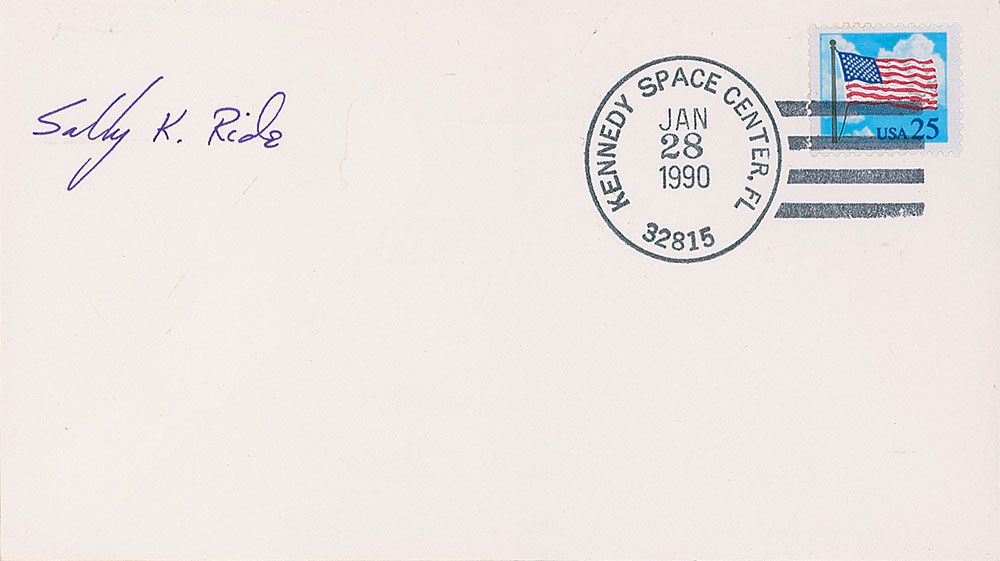 Mailing envelope, 6.5 x 3.75, bearing a January 28, 1990, Kennedy Space Center postal cancellation, signed in purple ink, “Sally K. Ride.” In fine condition.