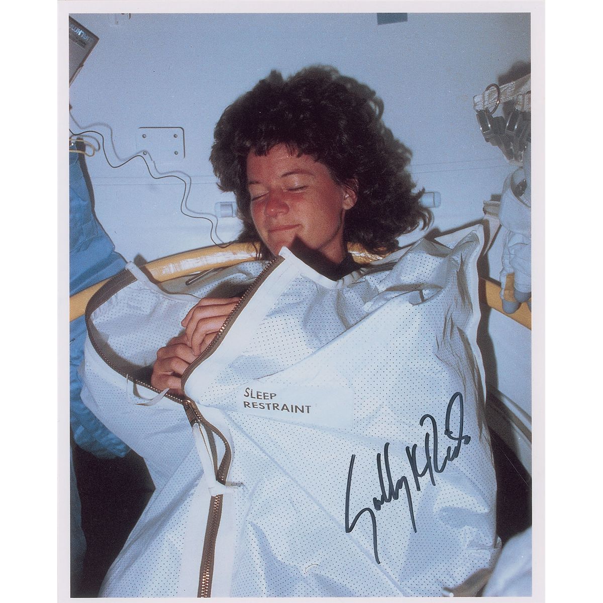Color satin-finish 8 x 10 photo of Ride nestled into a sleep restraint during her history-making shuttle flight, signed in black felt tip. In very fine condition.