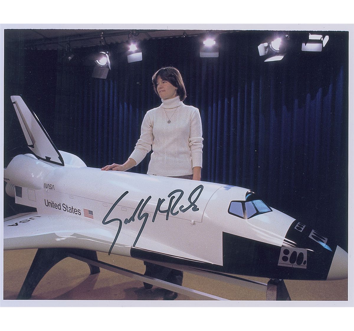 Color satin-finish 10 x 8 photo of Ride posing in front of a large model of the space shuttle, signed in black felt tip, “Sally K. Ride.” In very fine condition.