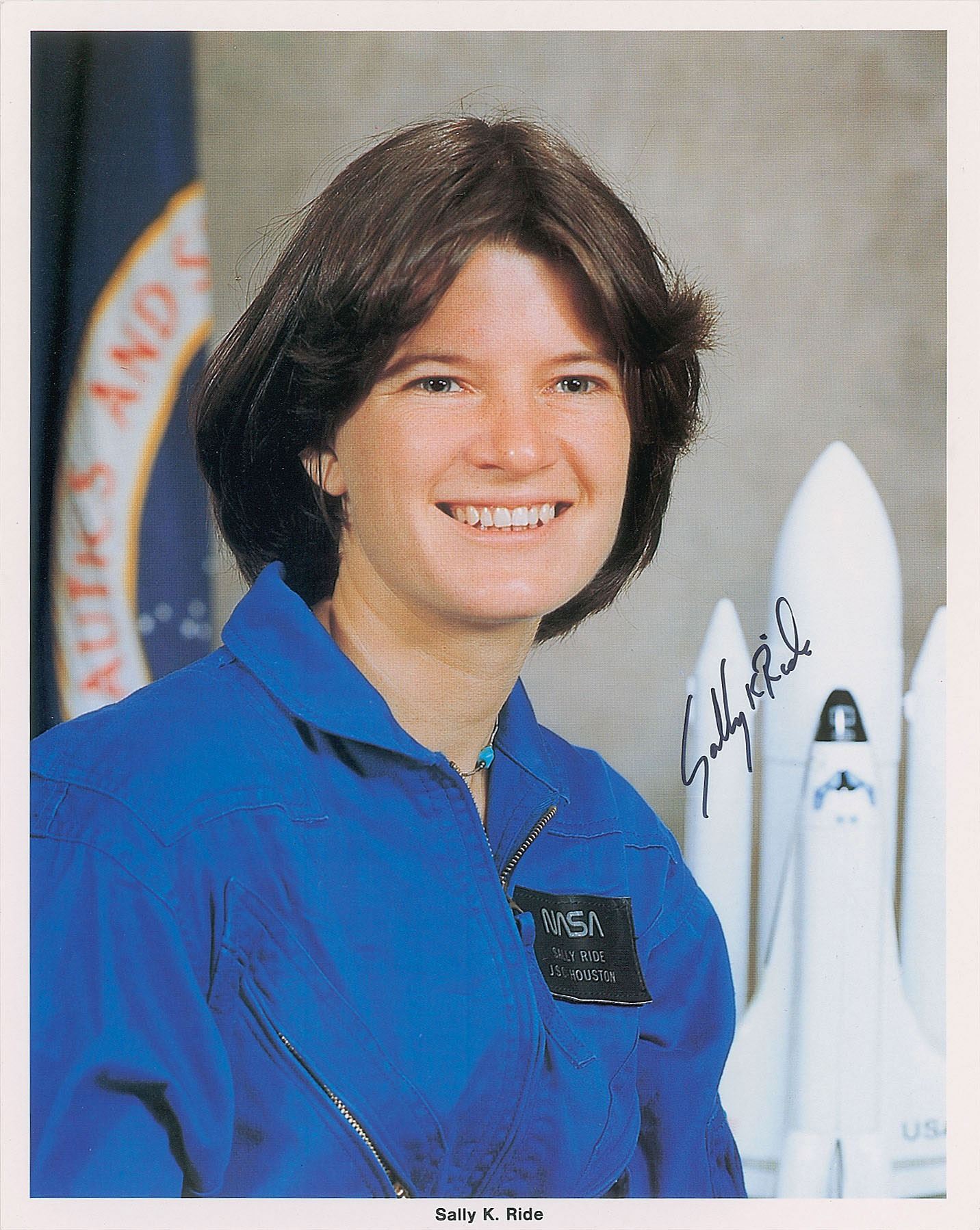 Official color 8 x 10 NASA lithograph of Ride posing in her blue flight suit in front of a Space Shuttle model, signed in black felt tip, "Sally K. Ride." In fine condition.