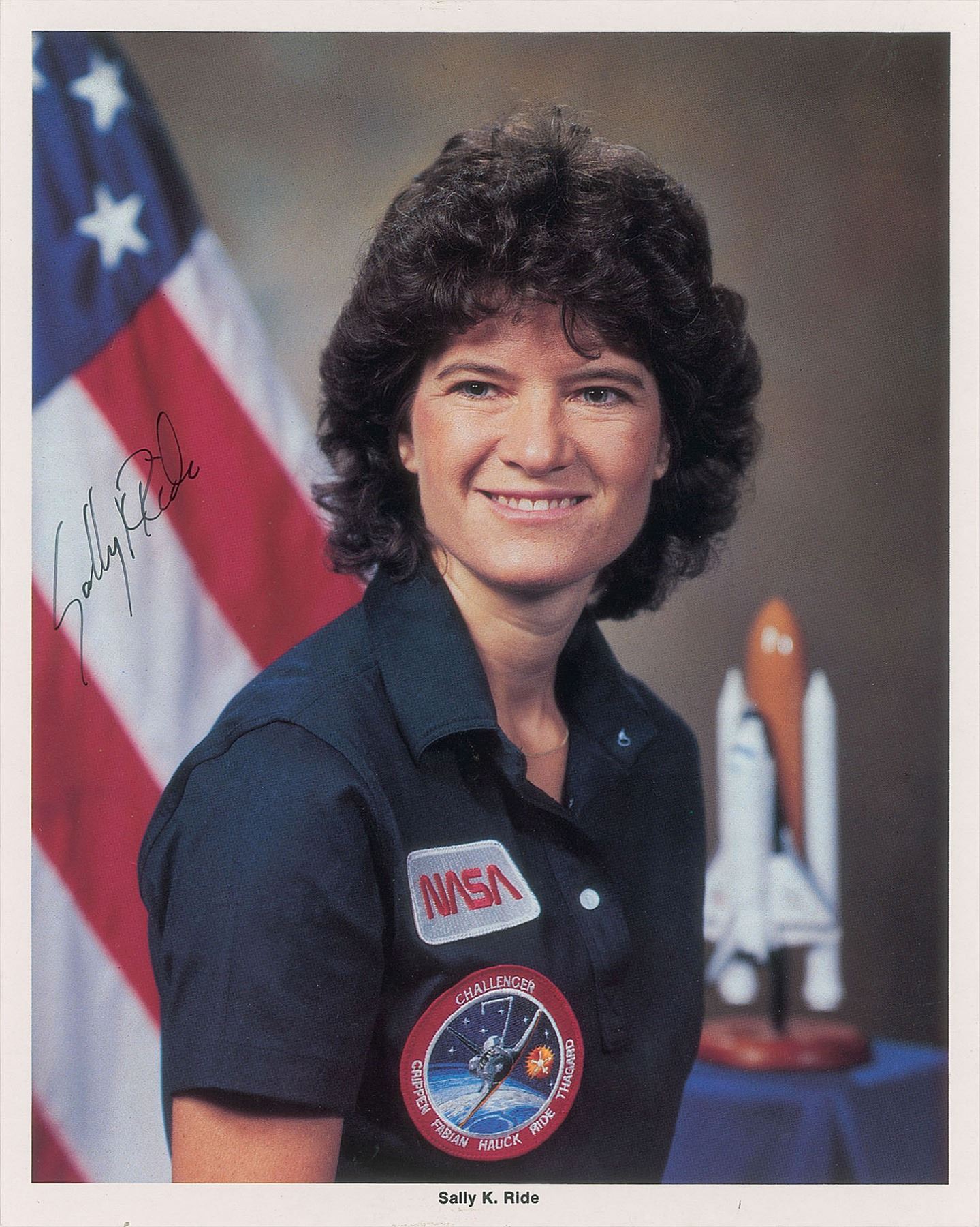 Official color 8 x 10 NASA lithograph of Ride wearing a collared shirt with STS-7 and NASA patches, signed in black felt tip, "Sally K. Ride." In fine condition.