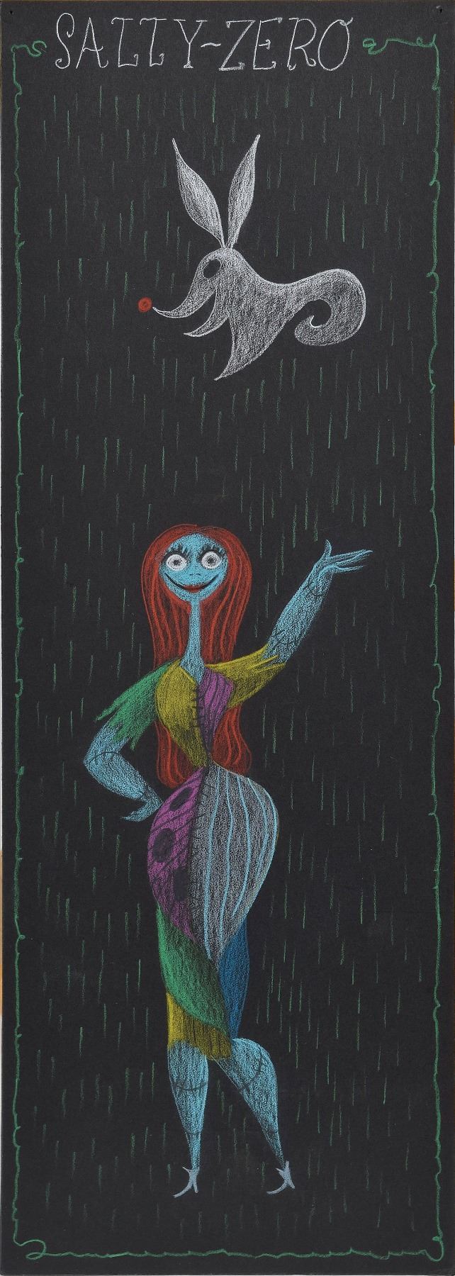 (Walt Disney Studios, 1993) Original storyboard concept drawing of Sally and Zero from Tim Burton's animated dark fantasy The Nightmare Before Christmas, showing the red-nosed ghost dog floating above a full-length image of Sally in her colorful stitched rags, with the border and background embellished in green and the upper section reading in white, “Sally–Zero.” Accomplished in pastel and colored pencil on black 6.5 x 18.5 artist's board. In fine condition, with tack holes to upper corners. A wonderful rare concept sketch of Jack Skellington’s most trusted friends.