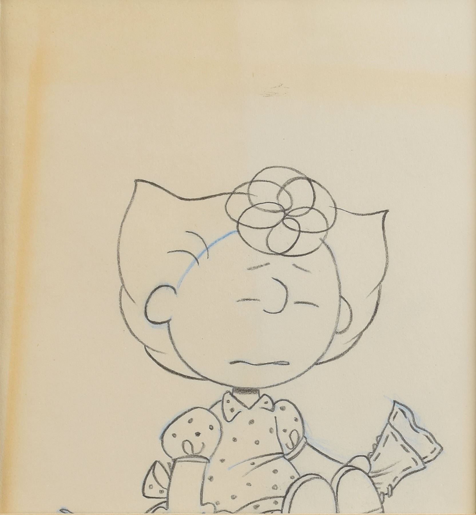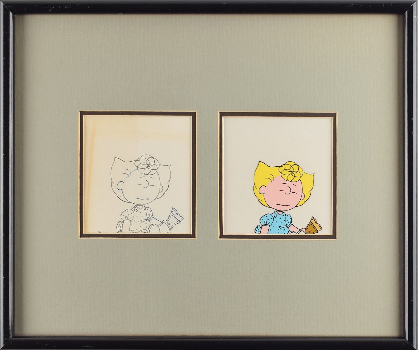(Bill Melendez Productions, circa 1970s-1980s) Original production cel and matching production drawing featuring Sally from Peanuts, showing Charlie Brown's younger sister with a very sad look on her face. Images measure 3.25 x 3.5, with mat openings of 5 x 5.5. Framed to an overall size of 19.5 x 16.5. In fine condition, with a light band of toning to the drawing.