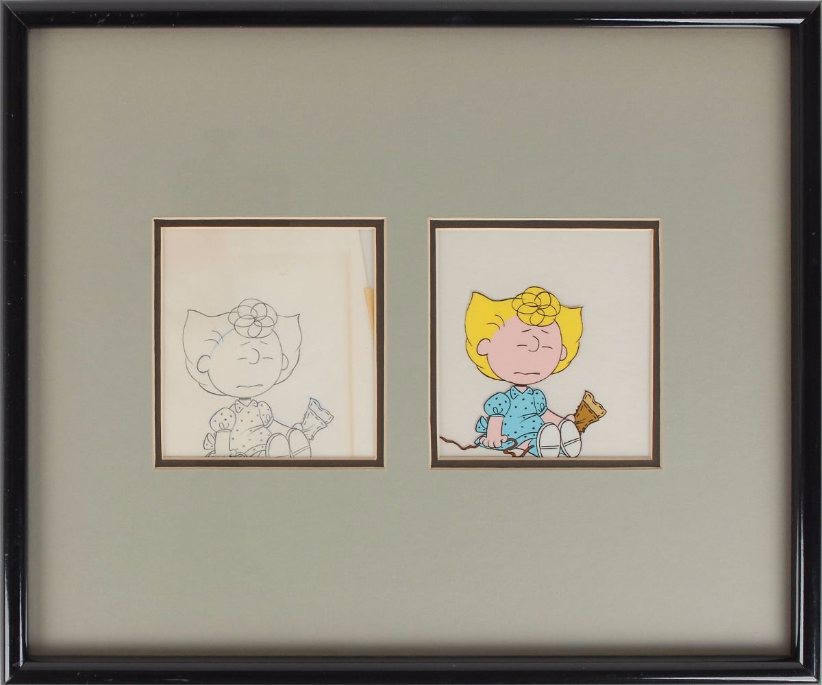 (Bill Melendez Productions, 1977) Original production cel and matching drawing featuring Sally from Peanuts, showing the forlorn young girl sitting with a string and package. Images measure 4 x 4, with mat openings of 5 x 5.25. This piece is also framed to an overall size of 19.5 x 16.25. In fine condition.
