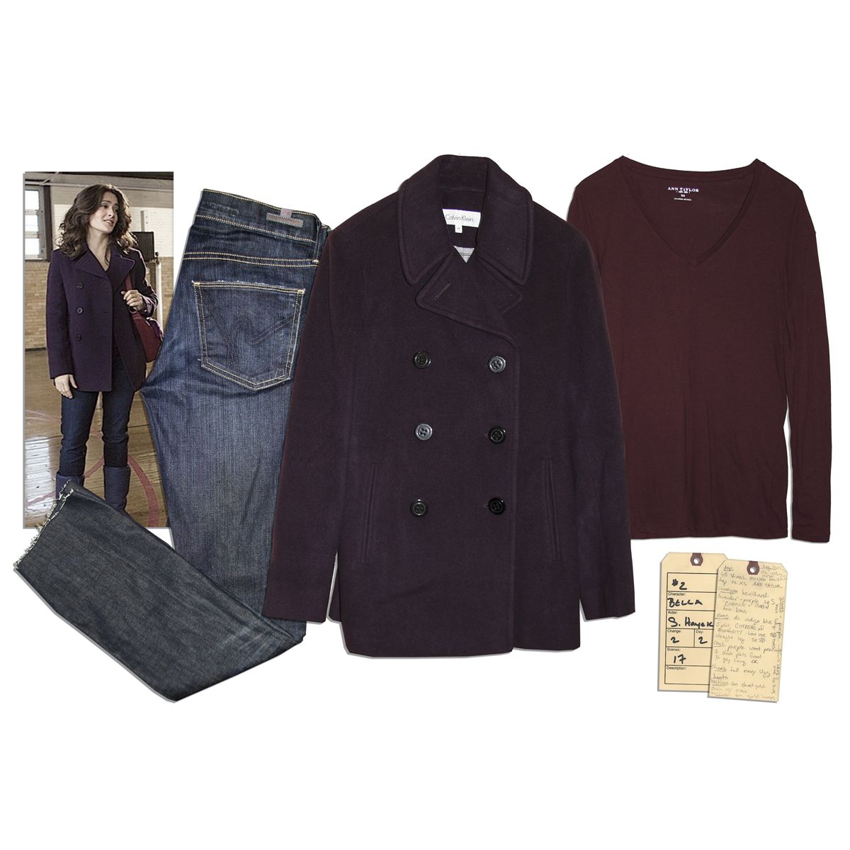 Salma Hayek ''Here Comes The Boom'' costume. Hayek stars in the Frank Coraci comedy as Bella Flores. Three-piece ensemble comprises: (1) wool peacoat in eggplant by Calvin Klein in size 2 petite, (2) maroon v-neck long-sleeved knit top by Ann Taylor in size XS, (3) heathered lavender cardigan sweater with brown buttons featuring integral shimmer by Charlie & Robin in size S, (4) dark denim low rise straight leg blue jeans by Citizens of Humanity in size 26. Near fine. With costumer's tag and a COA from Screen Used Movie Props.