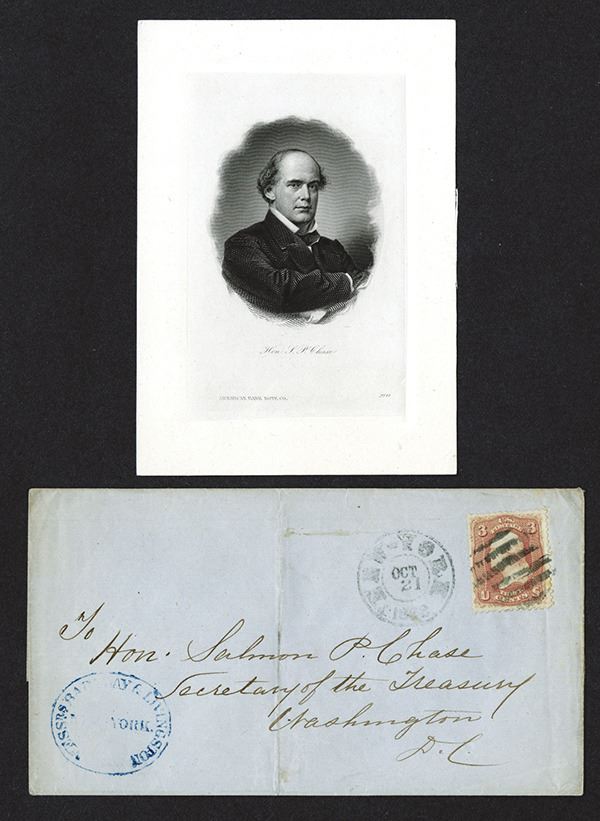 United States. American Bank Note Co. vignette on india paper mounted to card. Stamped envelope address to Chase, postmarked NY October 21, 1862. 2 pieces.
