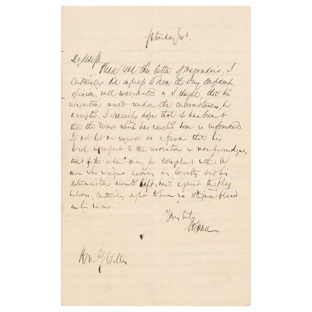 ALS signed “S. P. Chase,†one page, 5.5 x 8.75, June 1, 1861. Handwritten letter to Secretary of the Navy Gideon Welles, in part: "Please read this letter of Magruder's. I certainly did express to him the very confident opinion, well warranted as I thought, that his indisposition would under the circumstances, be accepted. I sincerely hope that it has been & that the rumor which has reached him is unfounded. If not let me request a favor that his wish in respect to the revocation…of the order may be complied with. A man who resigns avowing his loyalty and his determination never to lift hand against the flag he loves, certainly ought to have no stigma placed on his name."