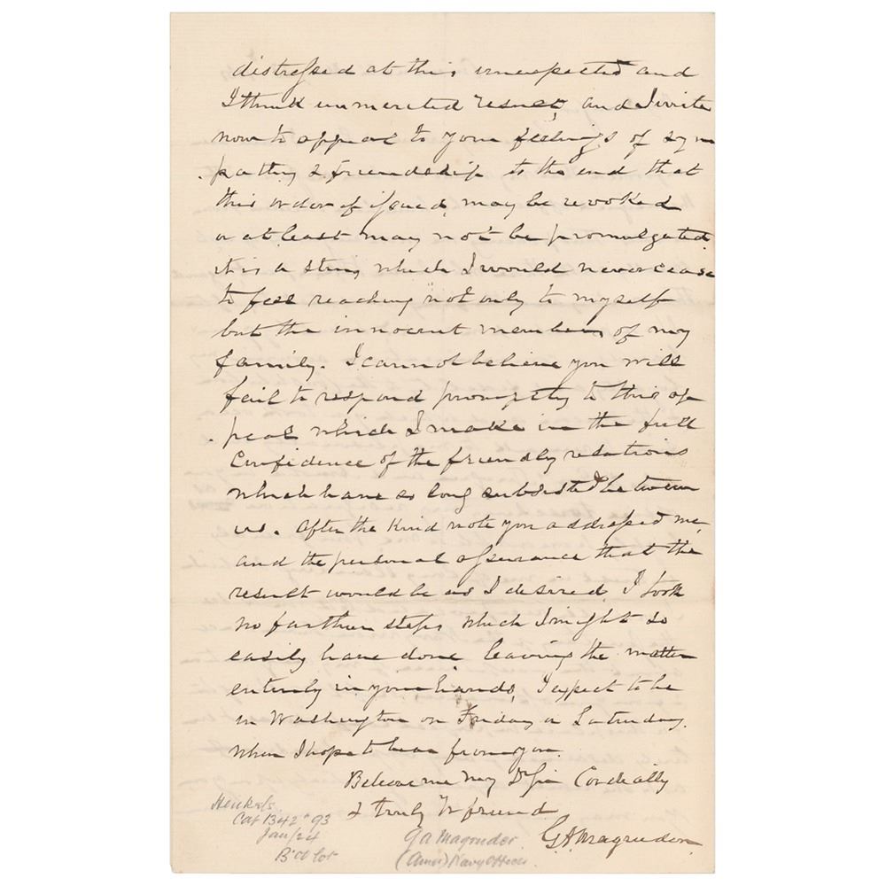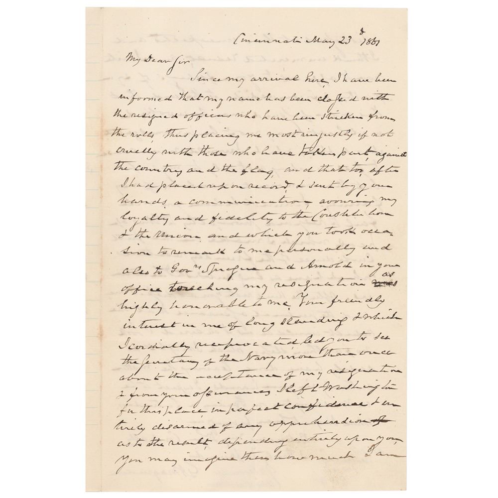 Chase writes on the integral leaf of a letter to him by "G. A. Magruder" of Cincinnati, in part: "Since my arrival here I have been informed that my name has been closed with the resigned officers who have been stricken from the rolls, thus placing me most injustly if not cruelly with those who have taken part against the country and the flag, and that too after I had placed up on record & sent by your hands a communication avowing my loyalty and fidelity to the Constitution & the Union. In fine condition. Accompanied by the original mailing envelope, addressed in Chase's hand to "Hon. Gideon Welles," and franked in the upper right, "S. P. Chase." G. A. Magruder may have been mixed up with John B. Magruder, who resigned his US Army commission in April 1861 to become a Confederate colonel.