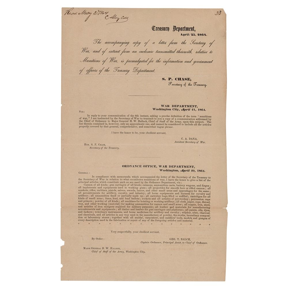 Civil War-dated printed circular from the Treasury Department and Salmon P. Chase as the secretary of the treasury, one page, 8.25 x 13.5, dated April 25, 1864, unsigned, which includes a copy of a letter from Assistant Secretary of War Charles A. Dana and an excerpt of a letter by Chief of Ordnance George T. Blach, in response to a query from the Secretary of the Treasury Salmon P. Chase, regarding a precise definition of "munitions of war." Because Collectors of Customs were especially to prohibit the transportation of "munitions of war" to the insurrectionary states of the Confederacy, it was important that they understood all items that fell within that definition.