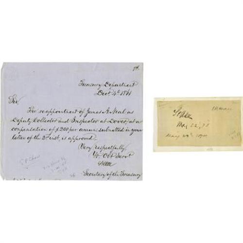 <B>Salmon P. Chase Letter Signed as Secretary of the Treasury</B></I> “<I>S. P. Chase</B></I>”. One page, 8” x 6.5”, Washington, D. C. , December 4, 1861. In this brief letter Salmon P. Chase (1808-1873) approves the re-appointment of a James A. Neal as Deputy Collector and Inspector at Dover. The letter is toned with age, with a 1.75” split at the fold crease, else very good. The letter is sold with a later Chase signature dated May 23, 1870, on a 4.5” x 2.5” paper affixed to a larger backing sheet, very good. <I>Ex. Henry E. Luhrs Collection.</B></I> <BR><BR><b>Shipping:</b> Flat Material, Small (<a target="_blank" href="http://www.heritageauctions.com/common/shipping.php">view shipping information</a>)