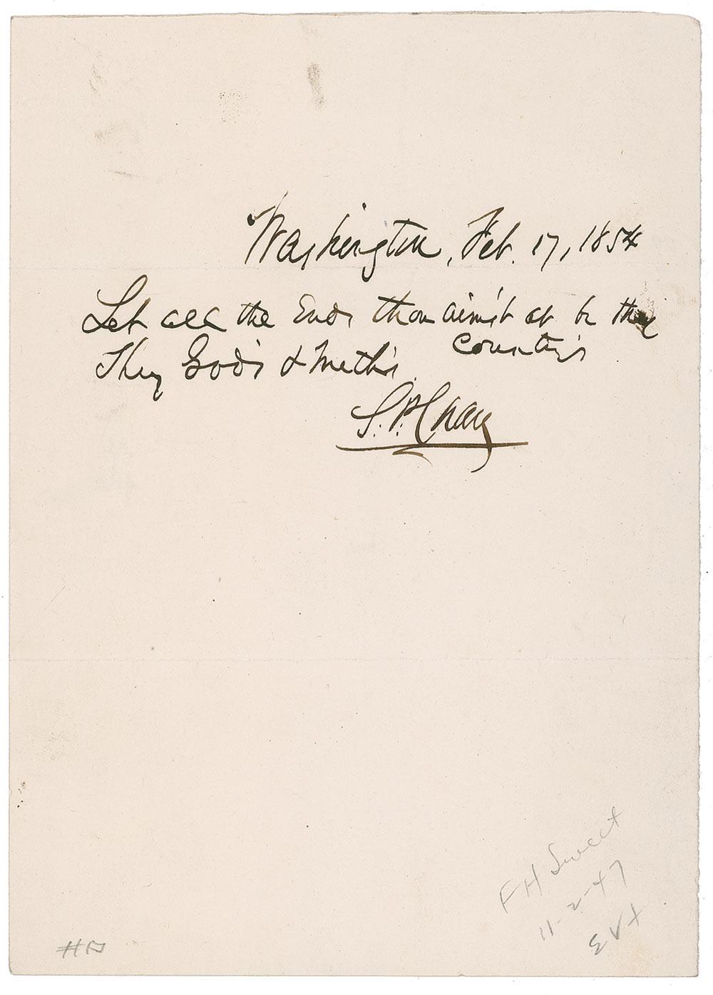 AQS on 5 x 7 off-white sheet, dated February 17, 1854. Chase pens a Shakespearean quote: “Let all the ends thou aimst at be thy country’s, thy God’s & truth’s. S. P. Chase.” In fine condition, with scattered soiling, show-through from past mounting residue on the reverse, and light pencil notations near the bottom of the page.