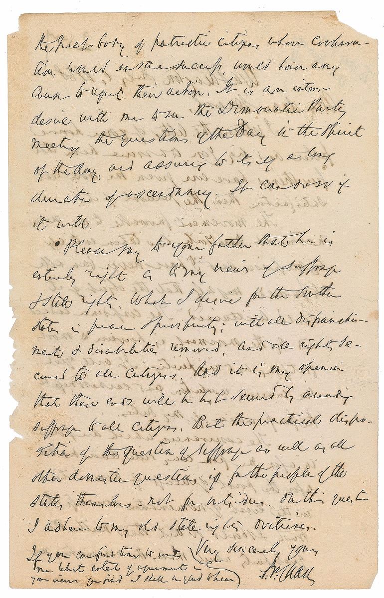 ALS signed “S. P. Chase,” one page both sides, 5.25 x 8.25, July 1, 1868. Letter to Thomas Ewing regarding a possible presidential nomination. In part: “I return the letter of your honored father…few things have ever given me more real satisfaction than the perusal of it. The movement favorable to my nomination at New York has taken entirely by surprise, and I have never been able to persuade myself that the object of it could be attained. The confidence advocated by the movement is however most gratifying and satisfying. It will give me increased resolution and earnestness in the performance of my duties. The assurances…from every side leave no doubt…of success and nomination & in the event of nomination and success, I trust I should so act that neither the great party which makes the nomination nor the great body of patriotic citizens…would have any chance to regret their action…Please say to your father that he is entirely right as to my views of suffrage & state rights. What I desire for the Southern states is peace & prosperity; with all disfranchisements & disabilities removed; and all rights returned to all citizens. And it is my opinion that these ends will be best secured by extending suffrage to all citizens. But the practical disposition of the question of suffrage as well as all other domestic questions is for the people of the States themselves…On the question I adhere to my old states rights overtures.” In very good condition, with intersecting folds, chipping and some surface loss to edges, and show-through from writing to opposing sides. Provenance: The Everett Fisher Collection.