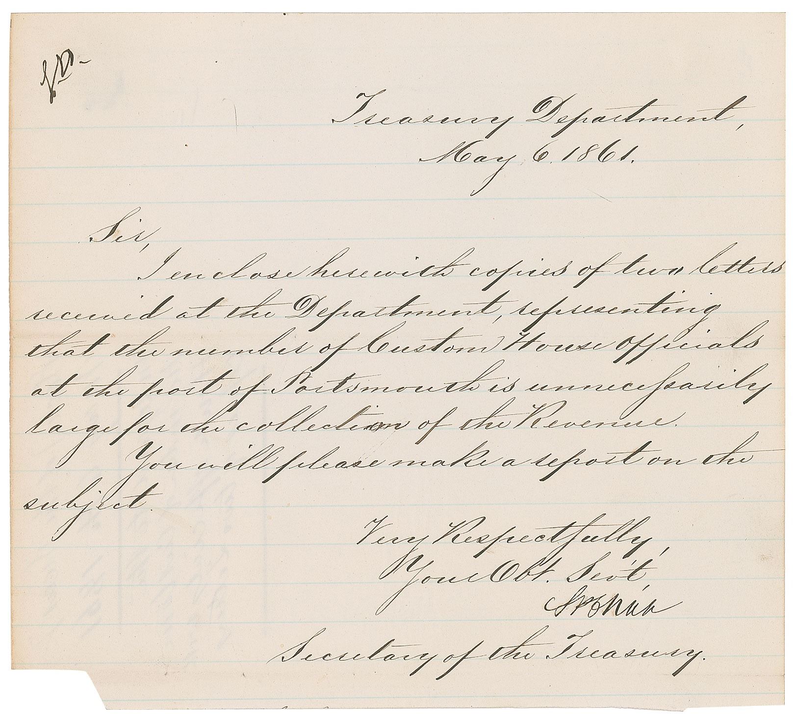 Civil War-dated LS as Secretary of the Treasury, signed “S. P. Chase,” one page, 7.75 x 7, May 6, 1861. In full: "I enclose herewith copies of two letters received at the Department, representing that the number of Custom House officials at the port of Portsmouth is unnecessarily large for the collection of the Revenue. You will please make a report on the subject." In fine condition, with trimming to the bottom. Accompanied by an engraving of Chase bearing a preprinted signature.