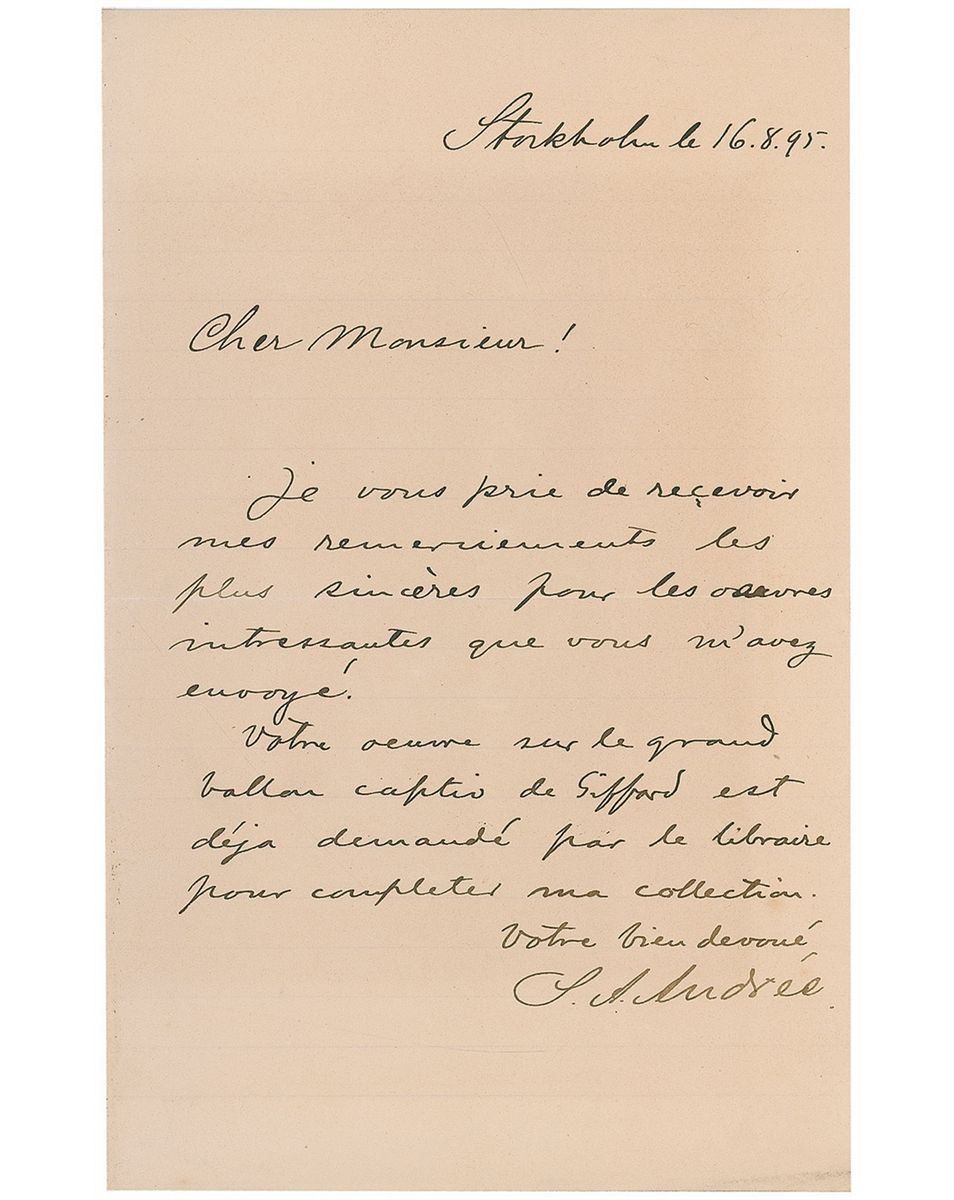 ALS in French signed “S. A. Andrée,” one lined page, 5.5 x 8.75, August 16, 1895, to the great French balloonist Gaston Tissandier. In full: “Please accept my sincerest thanks for the interesting works you sent me. Your book on the great captive balloon of Giffard has already been ordered by the bookseller to complete my collection.” In fine condition, with some light creasing. Accompanied by the original mailing envelope, addressed in Andrée’s hand. Since Andrée died at 42 and was little known before his doomed flight, his letters are very rare. An interesting letter associating the names of three great balloonists: Andrée, Giffard and Tissandier.
