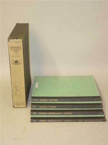 Salomonsky, Verna Cook. Masterpieces of Furniture Design - 4 Volumes in a Slipcase. Grand Rapids: Periodical Publishing Co., 1931. Folio - over 12" - 15" tall. Ex-Library. Good condition. 4 leaves of initial text with unbound plates in portfolios, protected in the original slipcase. Includes chairs, settees, tables, sideboards, chests, desks, secretaries, highboys, beds and misc. Printed on fine glossy paper. Each illustration has accompanying text and design plan.